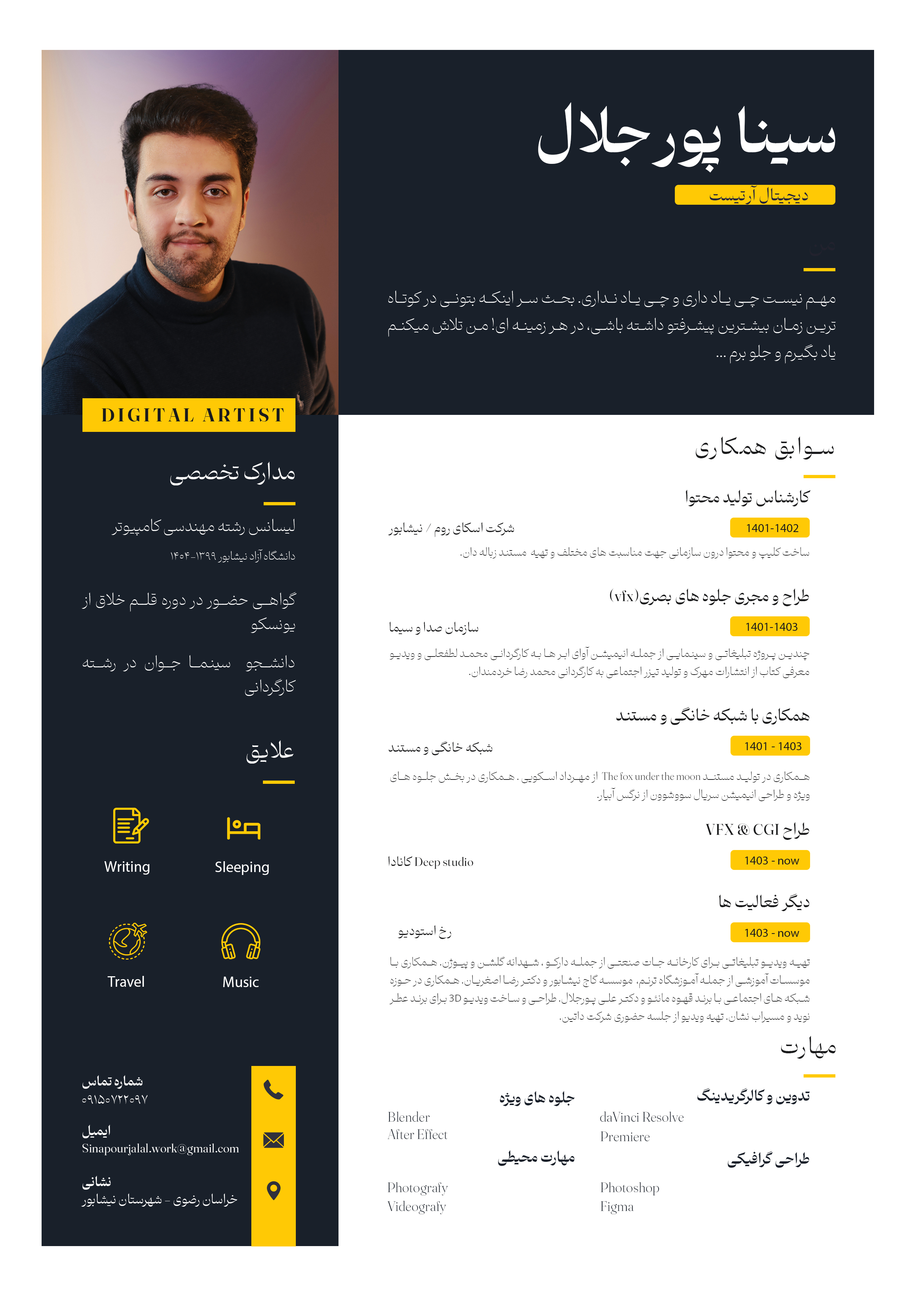 Iām Sina, a digital artist and designer specializing in visual effects (VFX), 3D design, and content creation in the XR field. My journey began with a passion for imagery and technology, and in 2021, I started working professionally in video editing and producing commercial content.